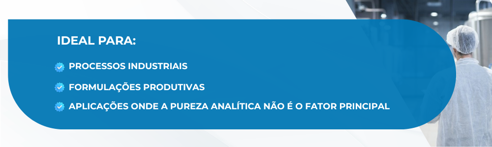 processos produtivos, formulações industriais ou aplicações menos críticas. Na prática, são as