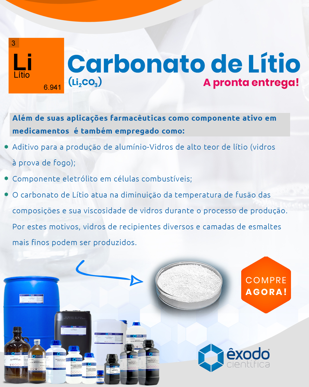 – O carbonato de Lítio atua na diminuição da temperatura de fusão das composições e sua viscosidade de vidros durante o processo de produção. Por estes motivos, vidros de recipientes diversos e camadas de esmaltes mais finos podem ser produzidos.